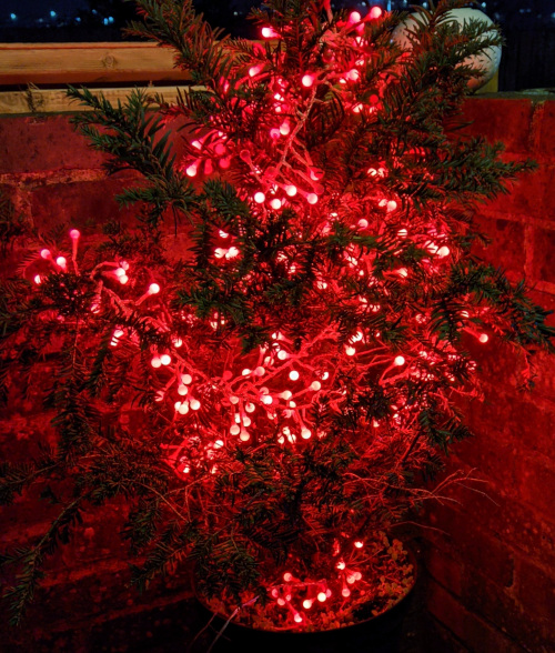 We placed a Christmas tree in our outdoor shelter. The red lights serve to make us feel warmer.